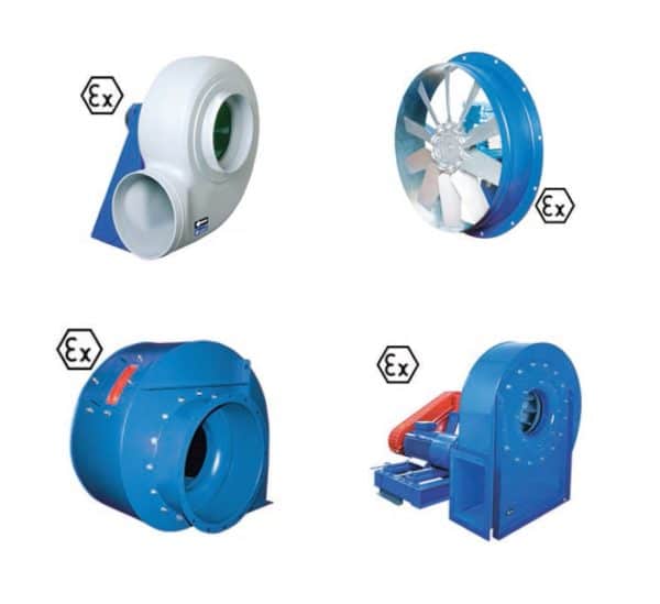 For this type of environment, fans installed both for air supplying and extracting must be ATEX certified. Industrial fans are protected against explosion by the use of aluminum or copper inlet rings, EEX motors and special coatings